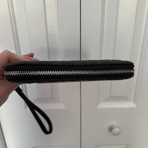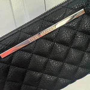 Steve Madden black leather wallet with quilted cushion design on exterior and wristlet strap for multipurpose use. Zipper pouch for change. Can hold 16 cards.