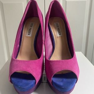 Super cute 3 tone suede peep toe heels. Heels have been used but are in really good condition! Approx. 5.5”