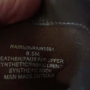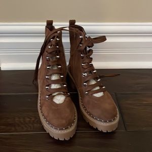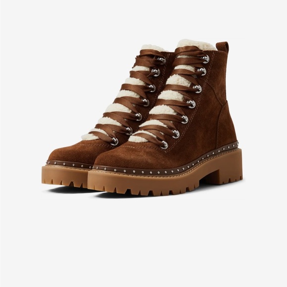 Stylish suede boots with faux shearling upper lining and extra -chunky lug sole. Side zipper and lace-up closure. Metallic eyelets and studs. Round toe. Suede leather upper. Textile and synthetic lining. Heel is approx 1.75” with 1” platform. 5” shaft height. Cognac color. Size 7, 8.5 and 6.5. The 6.5 size has a spot on the left shoe. Please see last picture. New without 📦