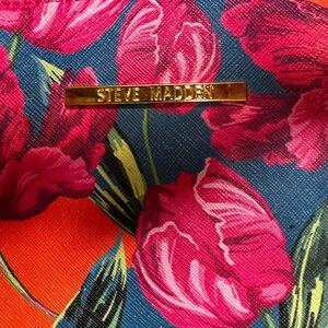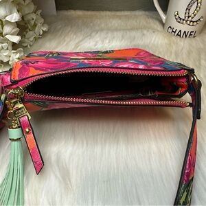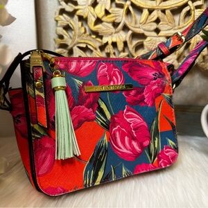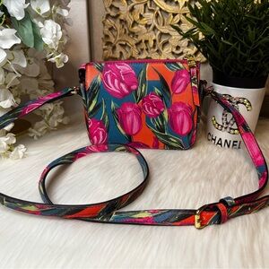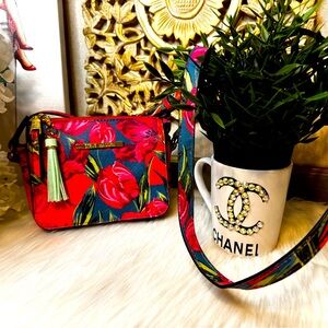 Vibrant red crossbody bag with bold floral design. Features a decorative tassel. Perfect for adding a pop of color.