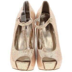 Steve Madden Revaa gold glitter mesh embossed peep open toe platform ankle strap pumps shoes. T-strap with adjustable buckle ankle strap.