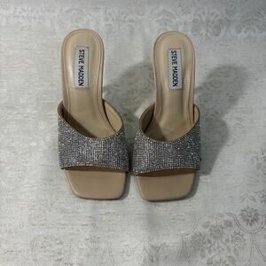 Step into the spotlight with these stunning Steve Madden rhinestone mules! Featuring a sleek nude base, square open toe, and a wide strap encrusted with shimmering crystals, these heels are perfect for weddings, bachelorette parties, date nights, or any glam event.