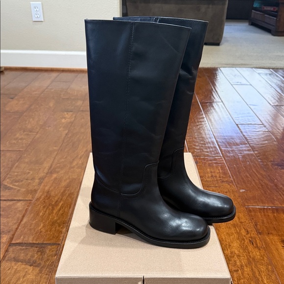 Chic black leather boots with a sleek design. Ideal for versatile styling.