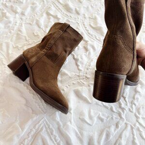 A square toe and angled stacked heel extended the Western-influenced look of this suede bootie finished with side pull loops for easy-on wear.