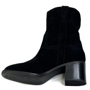A square toe and angled stacked heel extended the Western-influenced look of this suede bootie finished with side pull loops for easy-on wear. 2.5" heel 7" shaft Leather upper/synthetic lining/rubber sole.