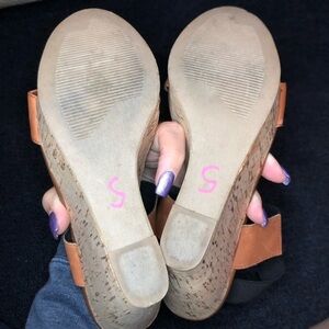 Steve Madden Roperr Brown & Black Strap Cork Wedge. The black strap is elastic, and has some stretch. Minimal signs of wear on the soles. In otherwise great preowned condition. Feel free to make a reasonable offer through the offer button!