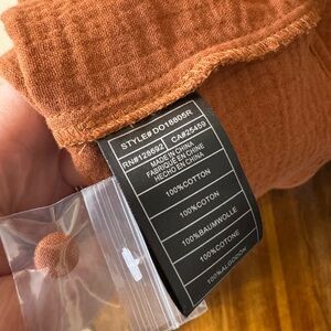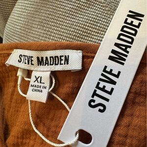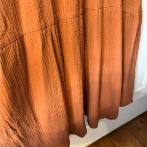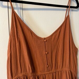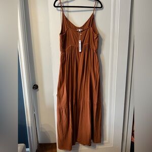 Steve Madden maxi dress in a warm rust-brown hue. Spaghetti straps (adjustable) with a subtle button-front bodice. Tiered skirt for gentle movement. Lightweight, textured fabric for easy wear.