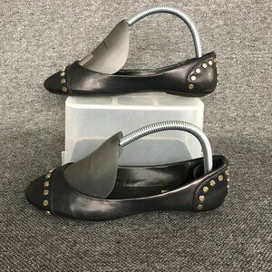 Edgy Steve Madden SLOAAN flats in black PU leather with gold tone studs around the cap toe and heel. Classic ballet silhouette with round toe and low profile rubber sole, great with skinny jeans, skirts or office outfits that need a little attitude. Women’s size 6.5M. Pre owned with normal wear including scuffs at toes, creasing, and outsole wear as shown in photos, but plenty of life left. Synthetic upper, lining and outsole, made in China.