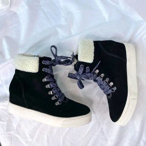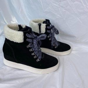 This is a wedged sneaker with Sherpa lining and side zip fastening.