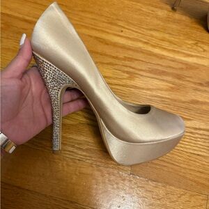 Shimmering gold heels with a sleek platform. Perfect for adding glamour to any outfit.
