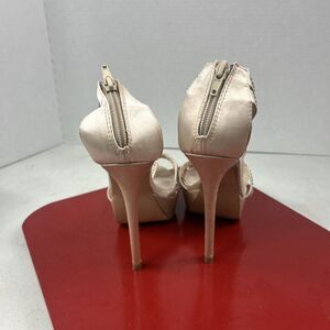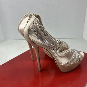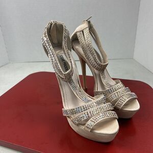Steve Madden Showstop Sandal Beige Tan Rhinestone Strappy Satin Heel Zipper 6M