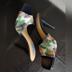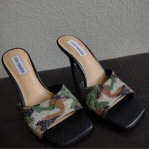 Step out in style with these eye-catching Steve Madden Signal-R square-toed, crystal embellished camouflage high heels. Featuring a 4 inch heel, unique camouflage print strap adorned with dazzling crystal rhinestones, these heels add a touch of edgy glamour to any outfit. Finished with a sleek black sole and a comfortable heel, they're perfect for making a statement.