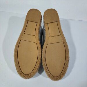 Steve Madden very soft leather women's shoe in size 8 USA, featuring a silver color and espadrille style. It has a lace-up design with a platform heel. The upper material is a soft supple leather and the shoe has a metallic theme.