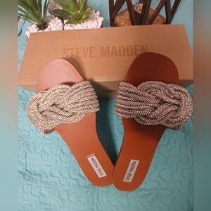 These Steve Madden sandals feature a sleek silver finish, perfect for adding a touch of elegance to your summer wardrobe. Designed with a comfortable flat sole, they are ideal for casual outings or beach days. The minimalist design ensures versatility, making them a must-have for any fashion-forward individual.