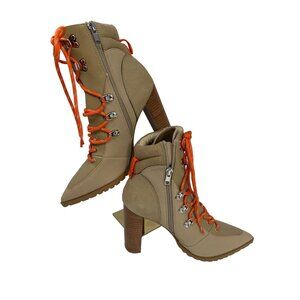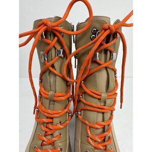 • Unworn but small mark on back heel of right boot, 4" heel, side zip entry, orange lace up front, padded ankle
