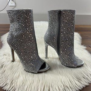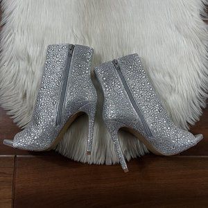 Steve Madden Women's Size 6.5 Silver Dispute R Embellished Peep Toe Stiletto Boot, Side Zipper Closure