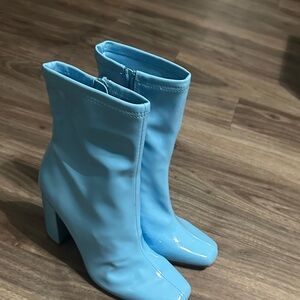 Chic sky blue boots with a glossy finish. Ideal for a modern look.