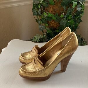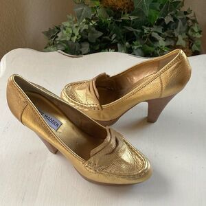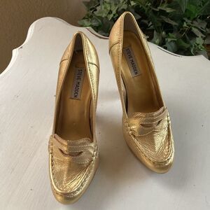 Steve Madden Slip On Gold Pebble Leather Platform Heeled Penny Loafers Size 8.5