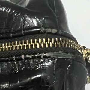 Features: 100% Polyurethane upper and trim. 100% Polyester lining. Gold Tone hardware. Zip closure. Zippered pocket inside with logo. Two slip pockets. Double top handles. Tassle and logo charm included.