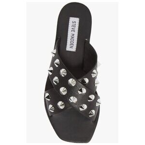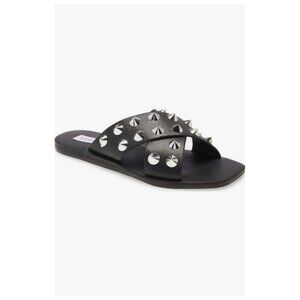 Dangerous-looking cone spikes add a little attitude to a square-toe slide sandal.