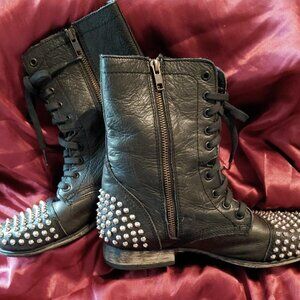 Rich black leather, mid calf, studs at round toe and heel, side zip and lace closure, 1.5" stacked heel.