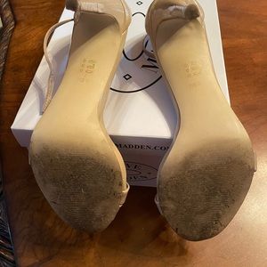 Condition: Worn once with a few subtle wear marks. Still in box. US shoe size 9.5. Round open toe. Buckle closure. Color: Blush/Beige Patent. Heel height: 4”/Stiletto. PU Upper Leather Lining & Sock Rubber Outsole.