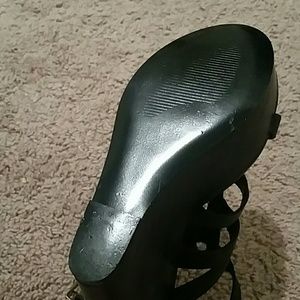 Cute black strappy leather wedges, something of a gladiator sandal-esque appearance.