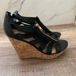 A fun strappy black sandal by Steve Madden with gold zipper detail. Wedge platform shoe super stylish! No wear on soles.