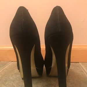 These sky high Steve Madden heels are the perfect way to dress up an outfit. The high heel is incredibly flattering and gives you legs for days. The gold piping details give a modern touch to a classic silhouette. The suede-like exterior is extremely durable and in perfect condition. Plus the sole of the shoes is gold!