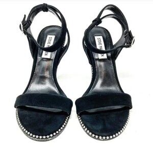 Steve Madden Sylvie Suede Leather Heeled Sandals - Size 8. Silver tone stud accents. Suede leather upper with man made sole. Ankle strap with buckle closure.