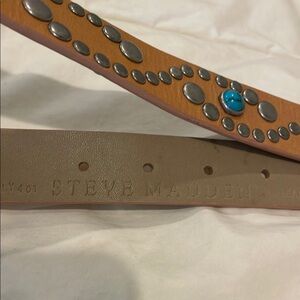 Stylish Steve Madden belt. Tan leather with silver studs. Turquoise embellishments add flair. Perfect for any outfit.