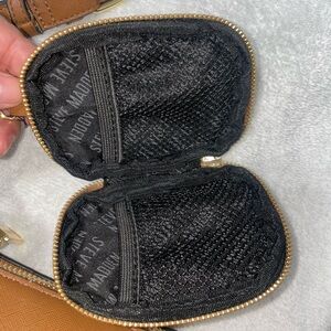 Chic tan crossbody featuring bold black branding. Ideal for daily wear.