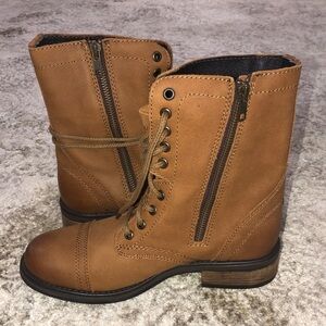 Stylish tan leather boots with lace-up front. Side zipper for easy access. Ideal for everyday wear.