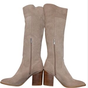 Elevate your style with these Steve Madden tan heeled boots, featuring a knee-high design and a genuine suede finish. The chunky block heel offers both comfort and sophistication, making them ideal for any occasion. These versatile boots are a must have addition to any wardrobe.