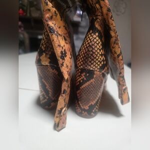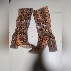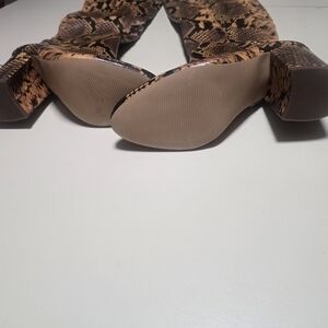 Elevate your look with these stylish snake print boots. Features a bold pattern and sturdy block heel.