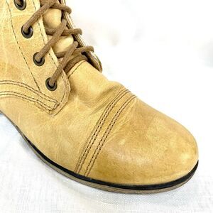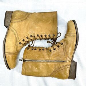 Leather is heavily distressed for battle-worn charm, with light blue top-stitching along the cap toe, heel, and lace-up panel, with thick, faded blue shoestrings that lace up past the ankle through brass grommets. Oversized tongue provides a slouchy look for über grunge appeal. 8" shaft has a 7.5" brass zipper at instep. 1" rubber block heel. Lightly cushioned leather insole and lining. Non-skid rubber sole.