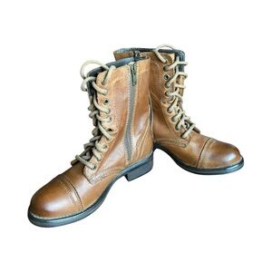 Stylish brown lace-up combat boots with side zippers. Perfect for a rugged look. Boots are in excellent condition. Few minor scuffs that add to the look.