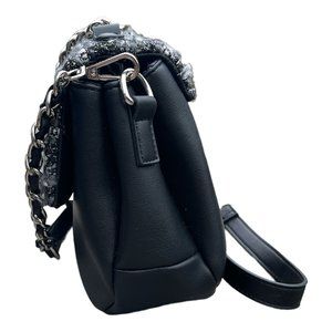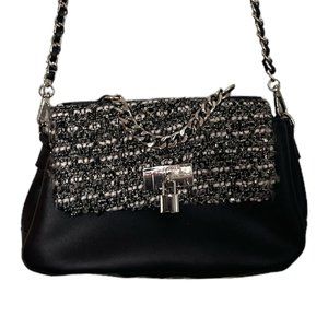 Features: Chain and tweed detailing, silver hardware, detachable and adjustable crossbody strap, snap closure, multiple interior pockets.