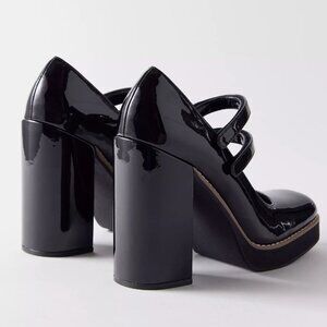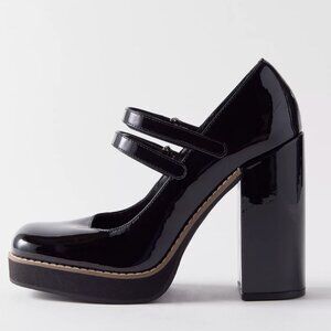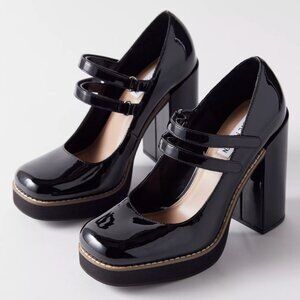 Step into sophistication with Steve Madden black patent leather heels, featuring chunky block heel and double strap design. Glossy finish & rounded toe add a touch of elegance, making them perfect for professional or evening wear. Platform sole ensures added height & stability, blending vintage charm with modern twist.