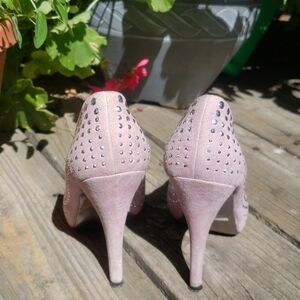 Neutral Lavender suede pumps. Silver rhinestone embellishment all over. 4.5" heel, 1" platform.