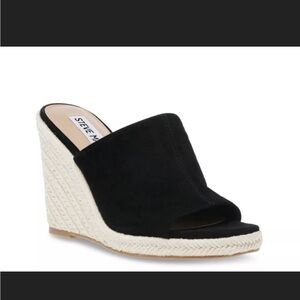 Step into style with these chic black wedge sandals. Perfect for any occasion, these shoes offer comfort and elegance. Original Box included
