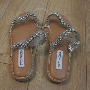 NEW, never worn. No flaws! Trendy, sparkly, yet casual! Features clear double straps and embellished with rhinestones.