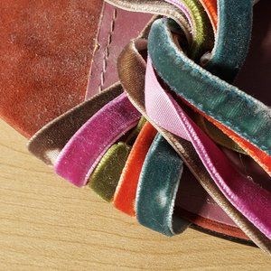 Unique peep toe retro style heels feature rust colored heel and multicolored velour ribbons that wrap the toe vamp. The name of the shoe is Velvett and they probably stopped making these a long time ago. Leather upper. **Shoes do have signs of wear (see pics)** Heel is 4"