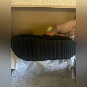 Black slippers, are a fuzzy material on the outside, size 6 in women, come in original box, brand new!!