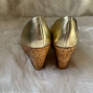 Steve Madden Visible leather gold perforated slip on wedge peep toe heels SZ 8M