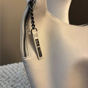 Experience the chic simplicity of the Steve Madden White Hobo Bag, featuring a smooth leather-like finish and a stylish crescent silhouette. Its wide opening and sturdy shoulder strap offer both functionality and elegance, making it a perfect addition to any wardrobe.