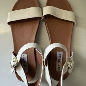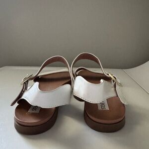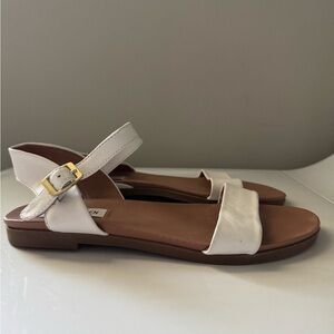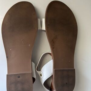 Elegant leather sandals with a white strap and brown soles. They are in gently worn condition, no flaws. The ankle buckle is gold.