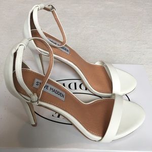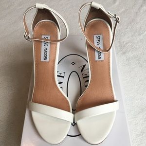 Good Condition, Steve Madden White leather strap sandals. Silver ankle buckle. Original box.
