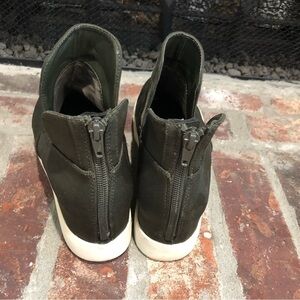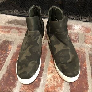 Steve Madden Winnie sneaker bootie in green camouflage. Inner sole has a 2.5” wedge heel and 1” platform. Back zip closure. Pre-owned and in very good condition. There is a bit of heel wear and minor wear on sides of shoe. Refer to pictures for imperfections. Size 8.5. Runs large, fits more like a 9.