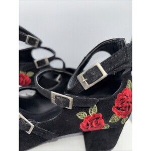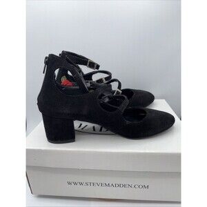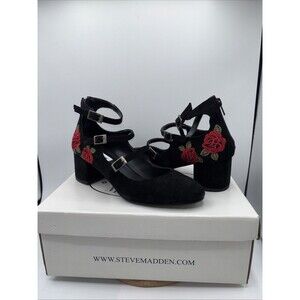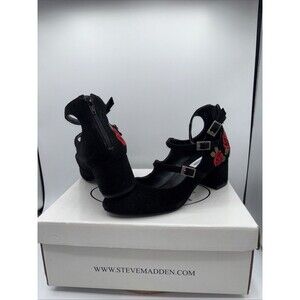 These Steve Madden Women Floral Gothic Black Sued 2 Block Zip UP Heels in size 8.5 are a stylish and versatile addition to any wardrobe. Featuring a round toe shape, buckle strap and zip up closure in the back, these heels have a mid heel height for all-day comfort. The floral pattern and gothic theme make them perfect for various occasions from casual to formal, adding a touch of edgy style to any outfit. The black color and block heel design from the brand Steve Madden ensure a fashionable and trendy look for any season.